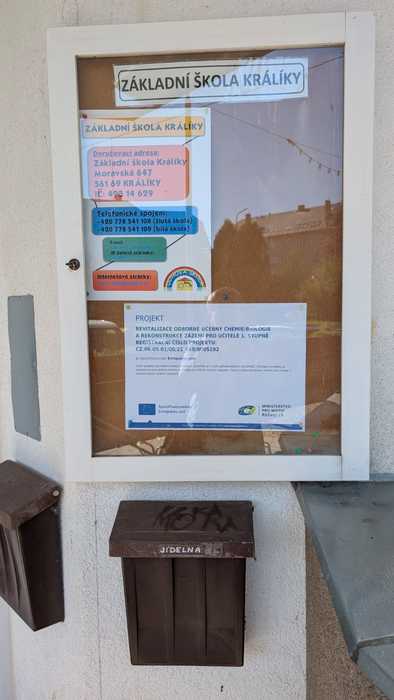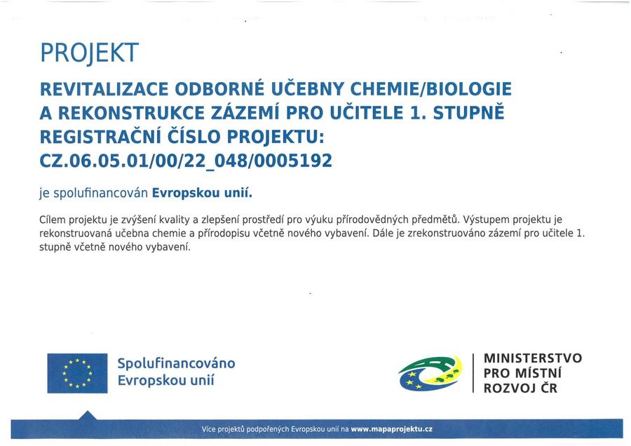 V rámci projektu Revitalizace odborné učebny chemie/biologie a rekonstrukce zázemí pro učitele 1.stupně, číslo projektu CZ.06.05.01/00/22_048/0005192 došlo k rekonstrukci odborné učebny pro výuku předmětů chemie a přírodopis. V učebně byla položena nová podlahová krytina, dále bylo vyměněno zastaralé osvětlení a umyvadla. Pro žáky byl pořízen nový moderní nábytek (lavice a židle) a také 15 sad pro chemické pokusy. Rovněž pracoviště pedagoga bylo obnoveno, byl pořízen nový demonstrační stůl, katedra a učitelský počítač. Dále byla realizována obnova zázemí pro pedagogy prvního stupně. Zde byla také provedena oprava podlahy a byl pořízen nový nábytek - vestavěné i úložné skříně, věšáky, stoly a nový učitelský počítač. Pro zajištění bezbariérovosti byl v rámci projektu pořízen pásový schodolez. Všechny popsané kroky vedou ke zlepšení pracovního prostředí jak pro žáky, tak pro pedagogy naší školy.